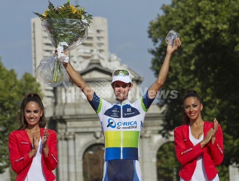 ステージ優勝を飾り、表彰式に臨むオリカ・グリーンエッジ・サイクリングチーム(Orica GreenEDGE Cycling Team)のマイケル・マシューズ(Michael Matthews、2013年9月15日撮影)。(c)AFP/JAIME REINA