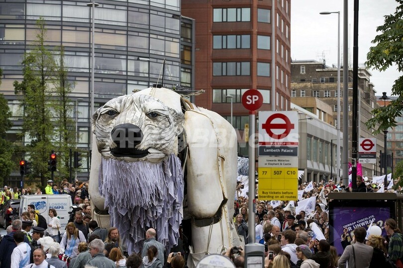 ロンドンに巨大ホッキョクグマ登場、保護団体のデモ行進で