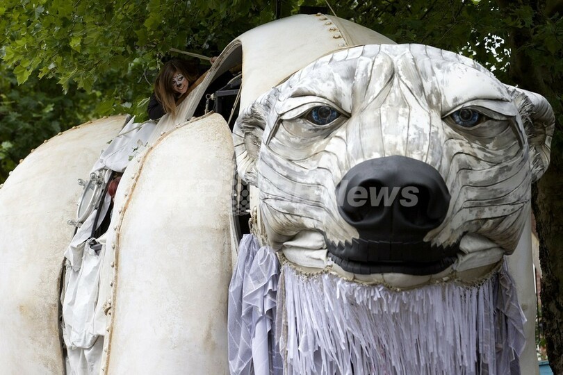 【9月16日 AFP】英ロンドン(London)で15日、ホッキョクグマをかたどった巨大山車「オーロラ(Aurora)」が市内を練り歩いた。環境保護団体「グリーンピース(Greenpeace)」が行った北極の環境保護を訴えるデモ行進を先導したこの巨大山車は、二階建てバスほどの大きさで、重量は約3トン。手足などの全関節が動くようになっており、同市ウエストエンド(West End)で大ヒットした舞台「ウオー・ホース(War Horse)」に携わったアーティストらを含む技術者15人が操った。(c)AFP