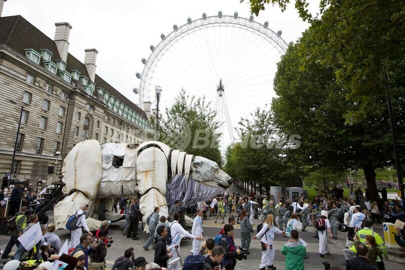 【9月16日 AFP】英ロンドン(London)で15日、ホッキョクグマをかたどった巨大山車「オーロラ(Aurora)」が市内を練り歩いた。環境保護団体「グリーンピース(Greenpeace)」が行った北極の環境保護を訴えるデモ行進を先導したこの巨大山車は、二階建てバスほどの大きさで、重量は約3トン。手足などの全関節が動くようになっており、同市ウエストエンド(West End)で大ヒットした舞台「ウオー・ホース(War Horse)」に携わったアーティストらを含む技術者15人が操った。(c)AFP