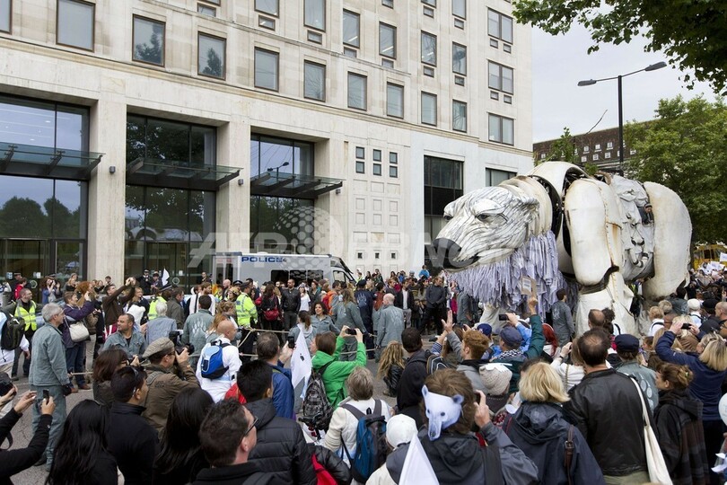 【9月16日 AFP】英ロンドン(London)で15日、ホッキョクグマをかたどった巨大山車「オーロラ(Aurora)」が市内を練り歩いた。環境保護団体「グリーンピース(Greenpeace)」が行った北極の環境保護を訴えるデモ行進を先導したこの巨大山車は、二階建てバスほどの大きさで、重量は約3トン。手足などの全関節が動くようになっており、同市ウエストエンド(West End)で大ヒットした舞台「ウオー・ホース(War Horse)」に携わったアーティストらを含む技術者15人が操った。(c)AFP