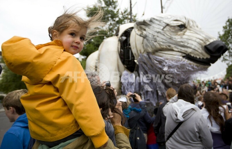 【9月16日 AFP】英ロンドン(London)で15日、ホッキョクグマをかたどった巨大山車「オーロラ(Aurora)」が市内を練り歩いた。環境保護団体「グリーンピース(Greenpeace)」が行った北極の環境保護を訴えるデモ行進を先導したこの巨大山車は、二階建てバスほどの大きさで、重量は約3トン。手足などの全関節が動くようになっており、同市ウエストエンド(West End)で大ヒットした舞台「ウオー・ホース(War Horse)」に携わったアーティストらを含む技術者15人が操った。(c)AFP