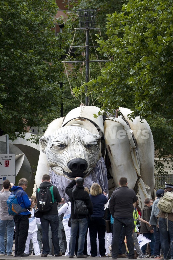 【9月16日 AFP】英ロンドン(London)で15日、ホッキョクグマをかたどった巨大山車「オーロラ(Aurora)」が市内を練り歩いた。環境保護団体「グリーンピース(Greenpeace)」が行った北極の環境保護を訴えるデモ行進を先導したこの巨大山車は、二階建てバスほどの大きさで、重量は約3トン。手足などの全関節が動くようになっており、同市ウエストエンド(West End)で大ヒットした舞台「ウオー・ホース(War Horse)」に携わったアーティストらを含む技術者15人が操った。(c)AFP