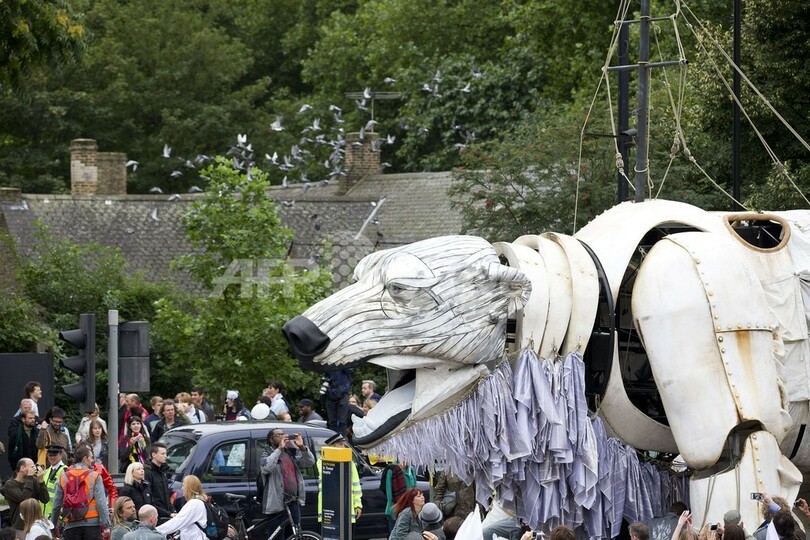 【9月16日 AFP】英ロンドン(London)で15日、ホッキョクグマをかたどった巨大山車「オーロラ(Aurora)」が市内を練り歩いた。環境保護団体「グリーンピース(Greenpeace)」が行った北極の環境保護を訴えるデモ行進を先導したこの巨大山車は、二階建てバスほどの大きさで、重量は約3トン。手足などの全関節が動くようになっており、同市ウエストエンド(West End)で大ヒットした舞台「ウオー・ホース(War Horse)」に携わったアーティストらを含む技術者15人が操った。(c)AFP