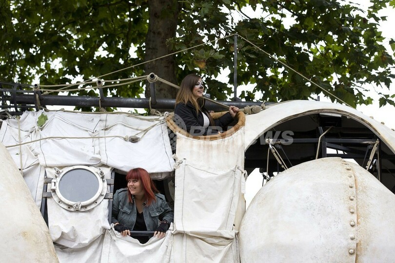 【9月16日 AFP】英ロンドン(London)で15日、ホッキョクグマをかたどった巨大山車「オーロラ(Aurora)」が市内を練り歩いた。環境保護団体「グリーンピース(Greenpeace)」が行った北極の環境保護を訴えるデモ行進を先導したこの巨大山車は、二階建てバスほどの大きさで、重量は約3トン。手足などの全関節が動くようになっており、同市ウエストエンド(West End)で大ヒットした舞台「ウオー・ホース(War Horse)」に携わったアーティストらを含む技術者15人が操った。(c)AFP