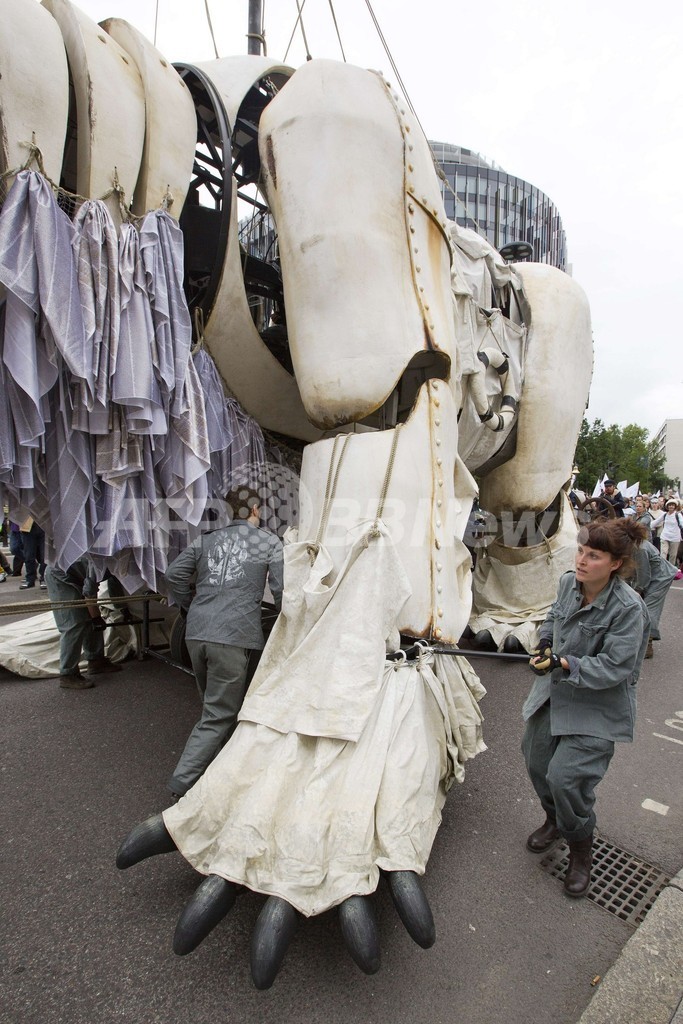 【9月16日 AFP】英ロンドン(London)で15日、ホッキョクグマをかたどった巨大山車「オーロラ(Aurora)」が市内を練り歩いた。環境保護団体「グリーンピース(Greenpeace)」が行った北極の環境保護を訴えるデモ行進を先導したこの巨大山車は、二階建てバスほどの大きさで、重量は約3トン。手足などの全関節が動くようになっており、同市ウエストエンド(West End)で大ヒットした舞台「ウオー・ホース(War Horse)」に携わったアーティストらを含む技術者15人が操った。(c)AFP