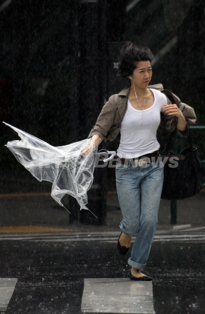 写真は、都内で強風を伴う大雨の中を歩く人(2013年9月16日撮影)。(c)AFP/Yoshikazu TSUNO