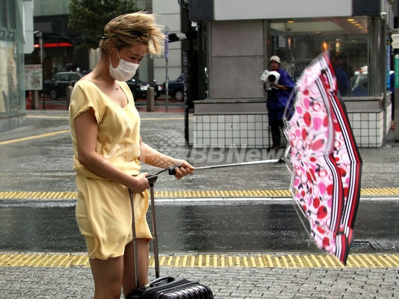 写真は、都内で強風を伴う大雨の中を歩く人(2013年9月16日撮影)。(c)AFP/Yoshikazu TSUNO
