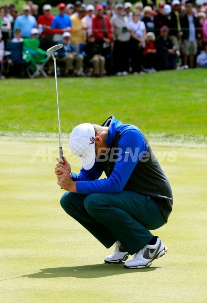 18番のグリーンでバーディーパットを外し座り込むニック・ワトニー(Nick Watney、2013年9月16日撮影)。(c)AFP/Getty Images/Sam Greenwood