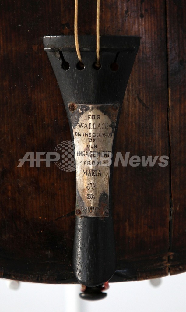 このバイオリンは、沈没事故に関する品々を集めた博物館「タイタニック・ベルファスト(Titanic Belfast)」にて18日から来月13日まで展示された後、英南西部ウィルトシャー(Wiltshire)州で来月19日、オークションにかけられる予定となっている。(c)AFP/Danny KEMP