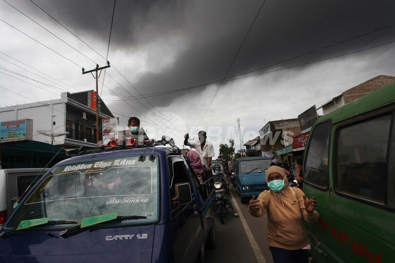 写真は、噴煙の下でマスクをかけ、北スマトラ州カロ(Karo)地区から避難する人たち(2013年9月17日撮影)。(c)AFP/ADE SINUHAJI