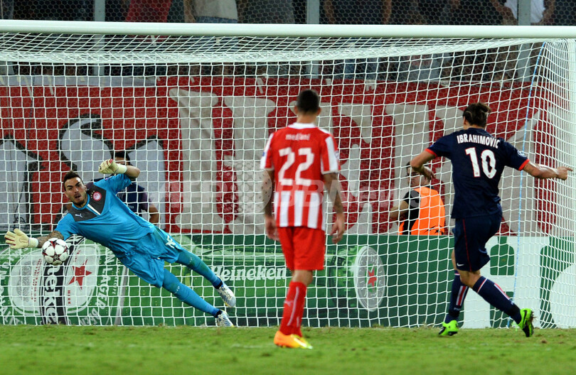 後半37分にPSGのズラタン・イブラヒモビッチ(Zlatan Ibrahimovic、右)のPKをセーブするオリンピアコスのGKロベルト(Roberto、左、2013年9月17日撮影)。(c)AFP/ARIS MESSINIS