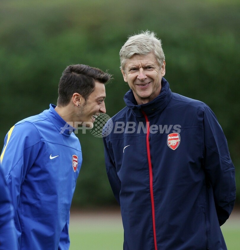 トレーニングに臨むアーセン・ベンゲル(Arsene Wenger)監督(右)とメスト・エジル(Mesut Ozil、2013年9月17日撮影)。(c)AFP/ADRIAN DENNIS
