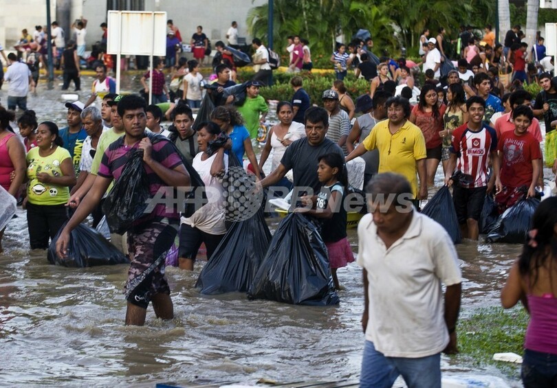 【9月18日 AFP】ほぼ同時に2つの暴風雨が直撃し、洪水が発生したメキシコ南西部ゲレロ(Guerrero)州の観光地アカプルコ(Acapulco)で17日、軍と民間航空会社が足止めされていた観光客らの輸送を開始した。同国で24時間以内に2つの熱帯暴風雨が発生したのは1958年以来初めて。一部の被災地では大型店舗からの略奪も発生しているという。