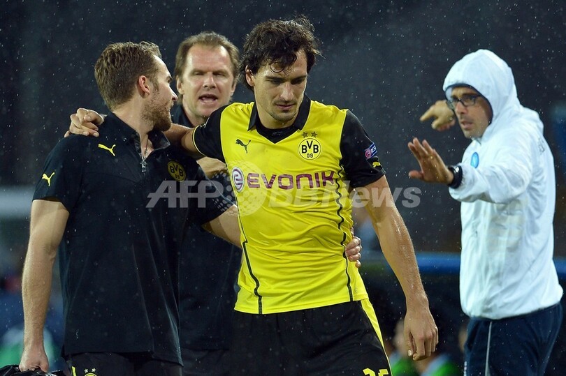 ピッチを後にするボルシア・ドルトムントのマッツ・ヒュンメルス(Mats Hummels、中央、2013年9月18日撮影)。(c)AFP/ALBERTO PIZZOLI