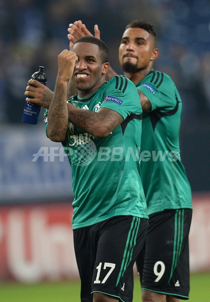試合に勝利し喜ぶシャルケ04のジェファーソン・ファルファン(Jefferson Farfan、2013年9月18日撮影)。(c)AFP/PATRIK STOLLARZ