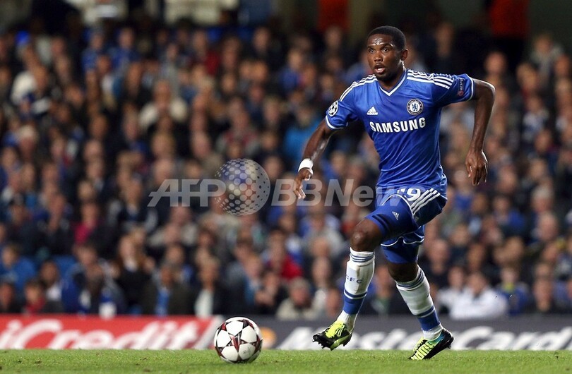 ドリブルでボールを運ぶチェルシーのサミュエル・エトー(Samuel Eto'o、2013年9月18日撮影)。(c)AFP/ADRIAN DENNIS