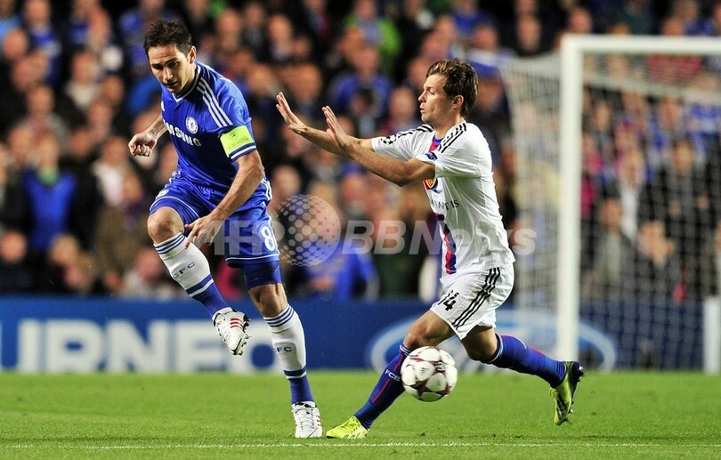 FCバーゼルのバレンティン・シュトッカー(Valentin Stocker、右)とボールを競るチェルシーのフランク・ランパード(Frank Lampard、2013年9月18日撮影)。(c)AFP/GLYN KIRK