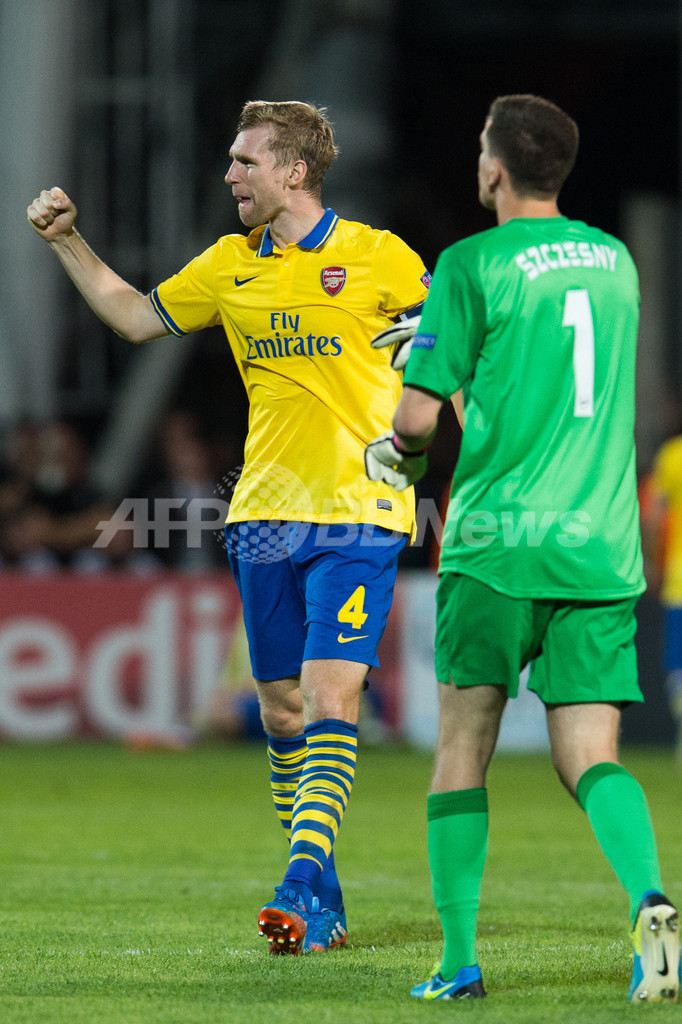 チームの得点に歓喜するアーセナルのペア・メルテザッカー(Per Mertesacker、2013年9月18日撮影)。(c)AFP/BERTRAND LANGLOIS