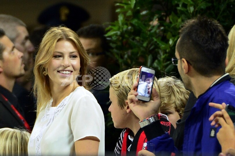 試合開始を待つシルビオ・ベルルスコーニ(Silvio Berlusconi)元首相の娘でACミランの役員を務めるバルバラ・ベルルスコーニ(Barbara Berlusconi)さん(左、2013年9月18日撮影)。(c)AFP/OLIVIER MORIN