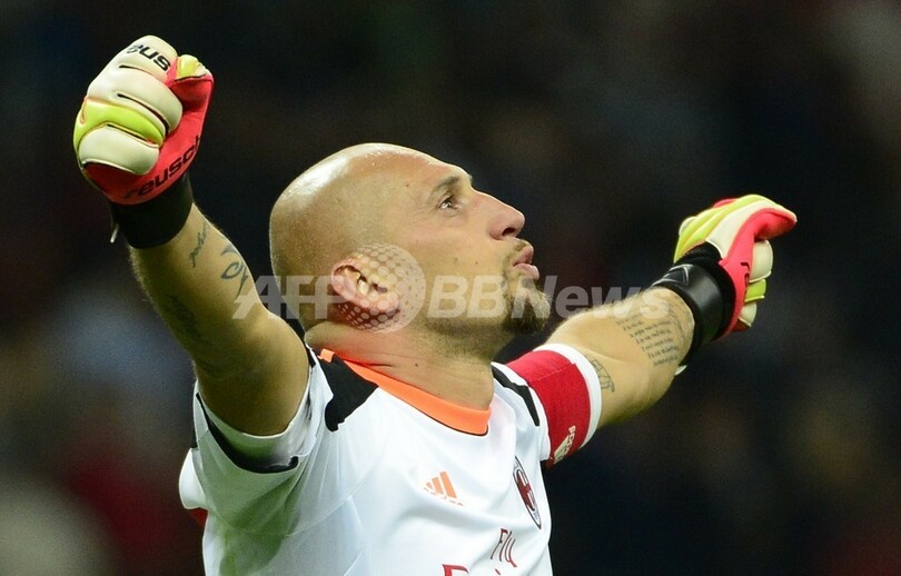 ガッツポーズを見せるACミランのGKクリスティアン・アビアッティ(Christian Abbiati、2013年9月18日撮影)。(c)AFP/OLIVIER MORIN