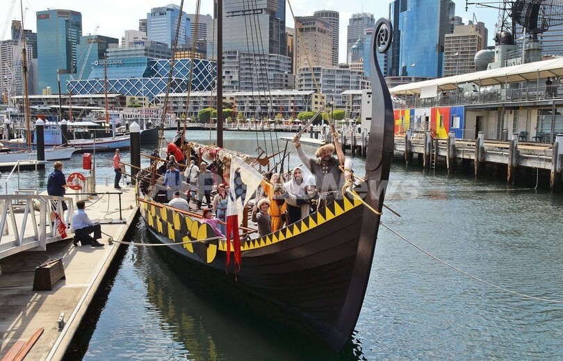 【9月19日 AFP】オーストラリア・シドニー(Sydney)の国立海洋博物館(National Maritime Museum)で18日、バイキングに関する最近の考古学的発見や数百点の遺物を集めた展示会の開幕を祝うオープニングイベントが開催され、バイキングに扮(ふん)した男たちが復元されたバイキング船をこいで博物館近くのダーリングハーバー(Darling Harbour)に上陸するパフォーマンスが披露された。
