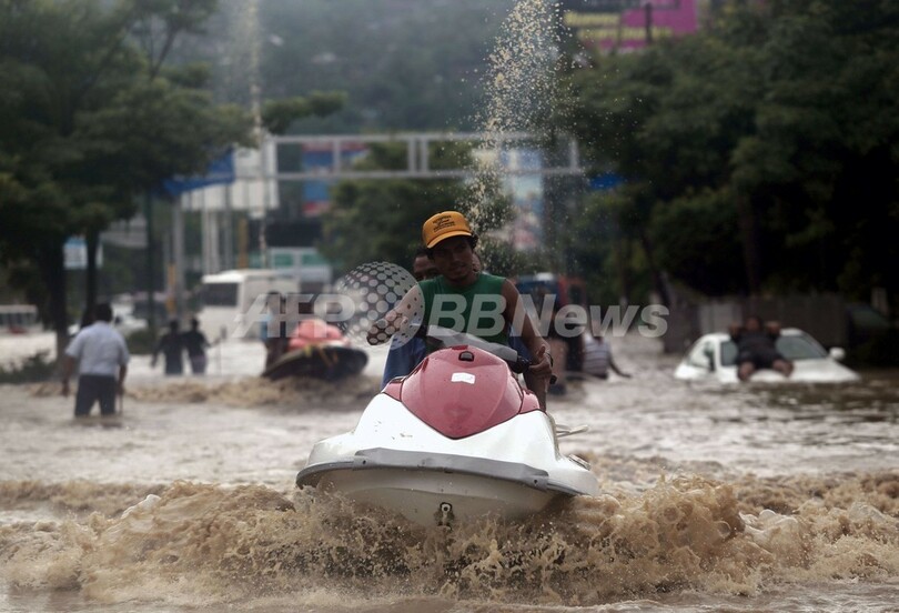 写真は、ゲレロ州アカプルコ(Acapulco)で、住民らをジェットスキーに乗せて冠水した道路を移動する男性(2013年9月16日撮影)。(c)AFP/Pedro Pardo