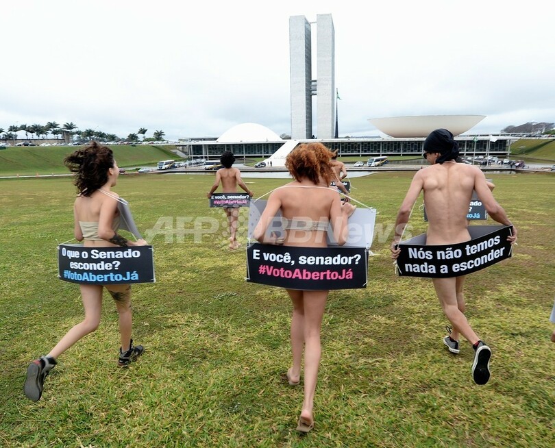 【9月19日 AFP】ブラジルの首都ブラジリア(Brasilia)の国会議事堂前で18日、グローバル・オンライン・コミュニティー「Avaaz」メンバーの若者グループが、裸で議会の秘密投票の廃止を訴える抗議デモを行った。若者たちは「何も隠すものはない」「私は全てを見せている」などと書かれたプラカードを掲げ、秘密投票制に抗議。主催者の1人は「非公開の投票は民主主義に反する。投票の公開を要求する」と述べた。