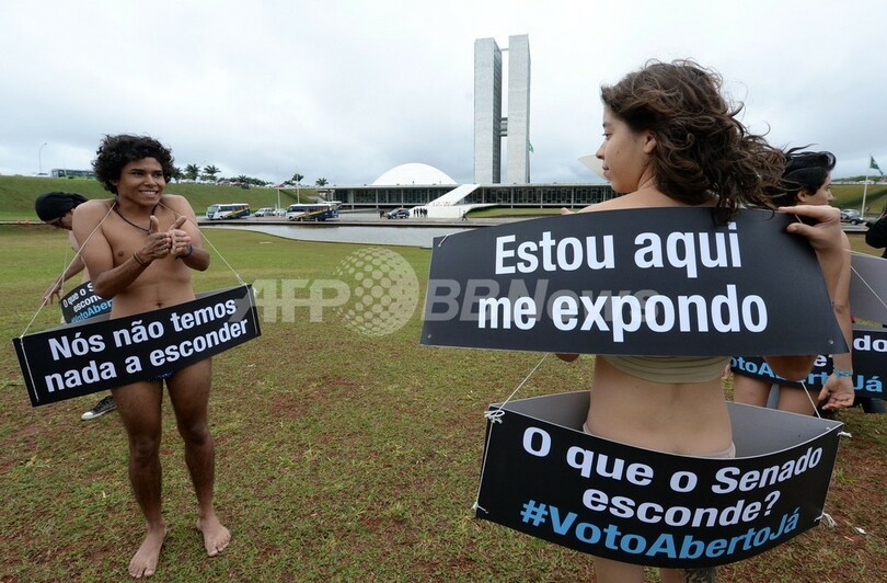 【9月19日 AFP】ブラジルの首都ブラジリア(Brasilia)の国会議事堂前で18日、グローバル・オンライン・コミュニティー「Avaaz」メンバーの若者グループが、裸で議会の秘密投票の廃止を訴える抗議デモを行った。若者たちは「何も隠すものはない」「私は全てを見せている」などと書かれたプラカードを掲げ、秘密投票制に抗議。主催者の1人は「非公開の投票は民主主義に反する。投票の公開を要求する」と述べた。