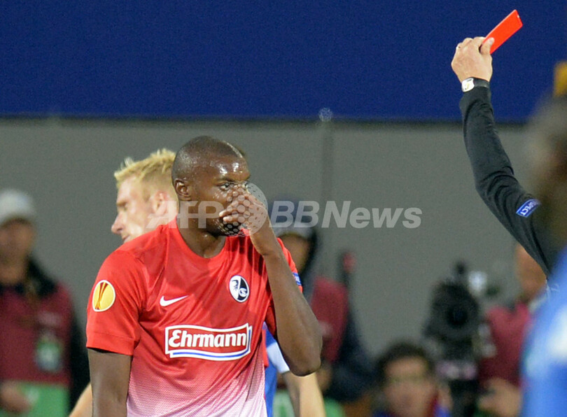 レッドカードを提示されるSCフライブルクのカリム・グエデ(Karim Guede、2013年9月19日撮影)。(c)AFP/THOMAS KIENZLE