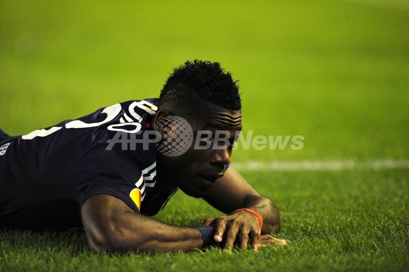 ピッチに倒れ込むオリンピック・リヨンのアンリ・ベディモ(Henri Bedimo、2013年9月19日撮影)。(c)AFP/CRISTINA QUICLER