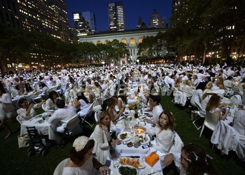 【9月20日 AFP】ニューヨーク(New York)で18日、毎年恒例のディネ・ブラン(Diner en Blanc)が開催された。エレガントな白の正装に身を包んだ大勢の男女が、バスケットに詰め込んで持参した食器に食べ物を盛りつけてテーブルに並べ、「即席」のディナーパーティーをブライアント・パーク(Bryant Park)で楽しんだ。フランスで始まり、今年で25回目となるこのイベントは、参加者には直前まで開催場所が知らされず、また白の正装での出席を求められ、椅子やテーブル、テーブルクロスも全て白色のものを持参しなければならない。(c)AFP