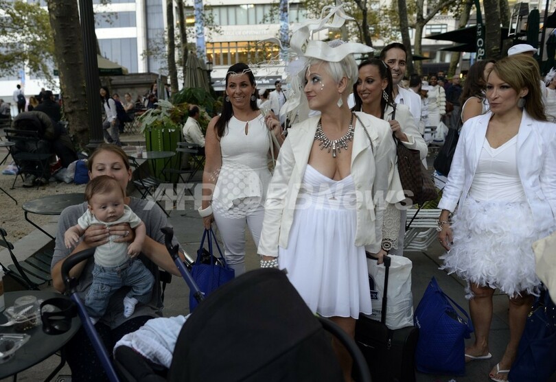 【9月20日 AFP】ニューヨーク(New York)で18日、毎年恒例のディネ・ブラン(Diner en Blanc)が開催された。エレガントな白の正装に身を包んだ大勢の男女が、バスケットに詰め込んで持参した食器に食べ物を盛りつけてテーブルに並べ、「即席」のディナーパーティーをブライアント・パーク(Bryant Park)で楽しんだ。フランスで始まり、今年で25回目となるこのイベントは、参加者には直前まで開催場所が知らされず、また白の正装での出席を求められ、椅子やテーブル、テーブルクロスも全て白色のものを持参しなければならない。(c)AFP