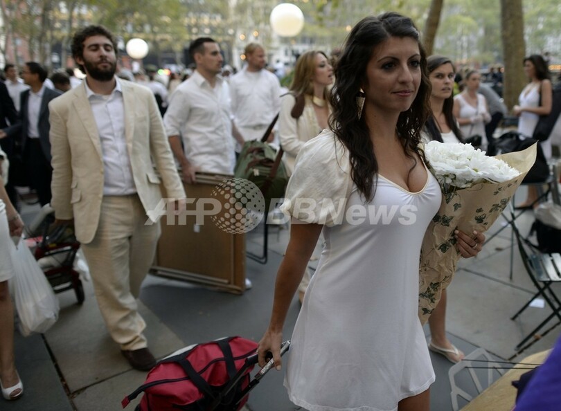 【9月20日 AFP】ニューヨーク(New York)で18日、毎年恒例のディネ・ブラン(Diner en Blanc)が開催された。エレガントな白の正装に身を包んだ大勢の男女が、バスケットに詰め込んで持参した食器に食べ物を盛りつけてテーブルに並べ、「即席」のディナーパーティーをブライアント・パーク(Bryant Park)で楽しんだ。フランスで始まり、今年で25回目となるこのイベントは、参加者には直前まで開催場所が知らされず、また白の正装での出席を求められ、椅子やテーブル、テーブルクロスも全て白色のものを持参しなければならない。(c)AFP