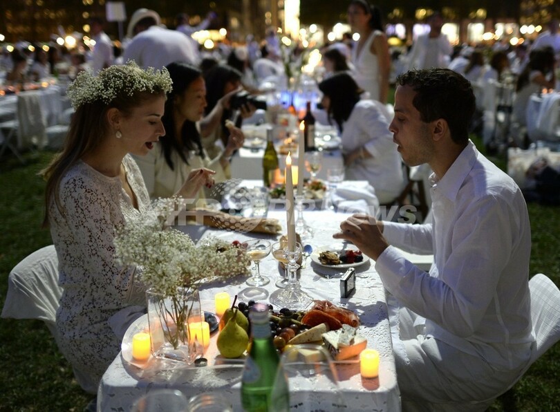 【9月20日 AFP】ニューヨーク(New York)で18日、毎年恒例のディネ・ブラン(Diner en Blanc)が開催された。エレガントな白の正装に身を包んだ大勢の男女が、バスケットに詰め込んで持参した食器に食べ物を盛りつけてテーブルに並べ、「即席」のディナーパーティーをブライアント・パーク(Bryant Park)で楽しんだ。フランスで始まり、今年で25回目となるこのイベントは、参加者には直前まで開催場所が知らされず、また白の正装での出席を求められ、椅子やテーブル、テーブルクロスも全て白色のものを持参しなければならない。(c)AFP