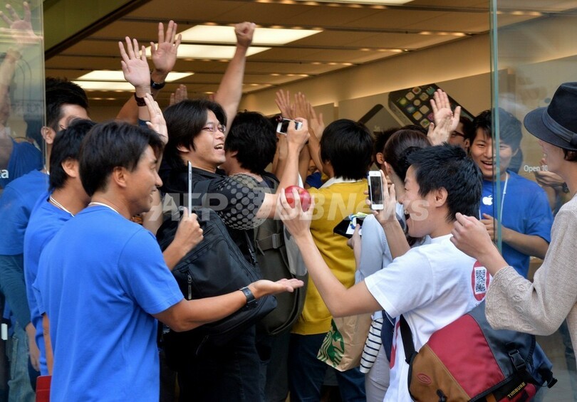 【9月20日 AFP】米アップル(Apple)の最新型スマートフォン(多機能携帯電話)「iPhone 5S」と廉価版の「iPhone 5C」が20日、日本でも発売開始となった。都内の直営店「アップルストア(Apple Store)」では、一番乗りで商品を手にした購入客の喜ぶ姿が見られた。(c)AFP