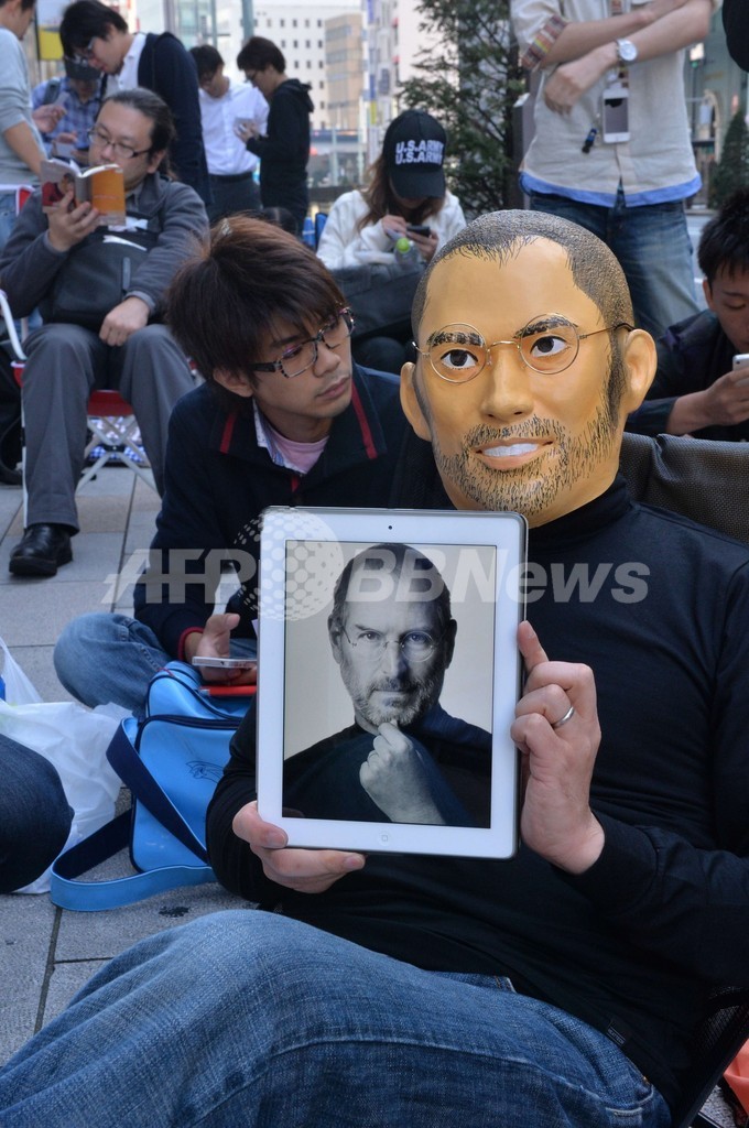 写真は、都内の「アップルストア」で、故スティーブ・ジョブス(Steve Jobs)氏のマスクをかぶって列に並ぶ人。手にしたiPadにもジョブズ氏の肖像が表示されている(2013年9月20日撮影)。(c)AFP/Yoshikazu TSUNO