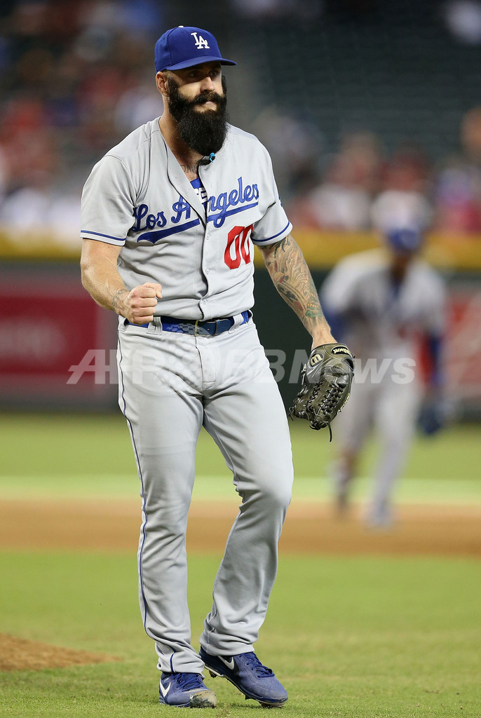 この日は両者ともに終盤まで互角の戦いが続いていたが、8回にリリーフ登板したドジャースのブライアン・ウィルソン(Brian Wilson)が相手の流れを断ち切ると、守護神ケンリー・ジャンセン(Kenley Jansen)が今季26セーブ目を記録した。(c)AFP