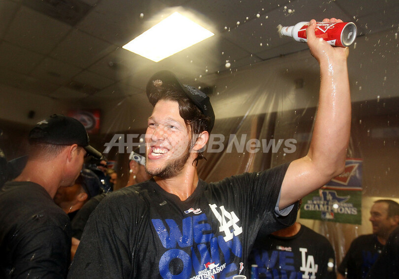 試合後のロッカールームで地区優勝を祝うドジャースのクレイトン・カーショウ(Clayton Kershaw、2013年9月19日撮影)。(c)AFP/Getty Images/Christian Petersen