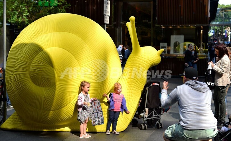 オーストラリア・シドニー(Sydney)で開催中のアートイベント「Art and About Sydney」の一環でハイドパーク(Hyde Park)に設置された、再生プラスチック製の巨大なカタツムリの前で記念撮影する子どもたち(c)AFP(2013年9月20日撮影)。(c)AFP/Saeed Khan