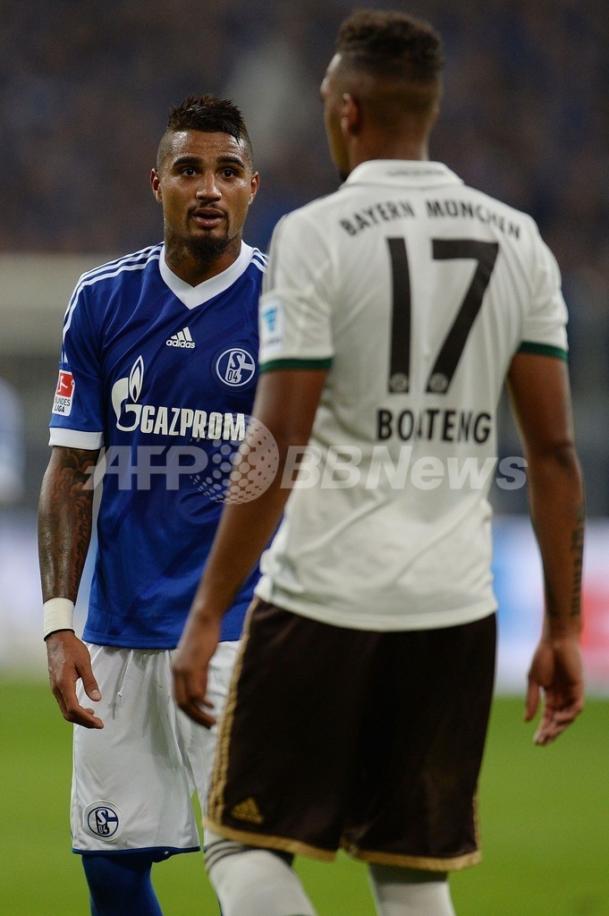 試合に臨むシャルケ04のケヴィン・プリンス・ボアテング(Kevin Prince Boateng、奥)とバイエルン・ミュンヘンのジェローム・ボアテング(Jerome Boateng、2013年9月21日撮影)。(c)AFP/ PATRIK STOLLARZ