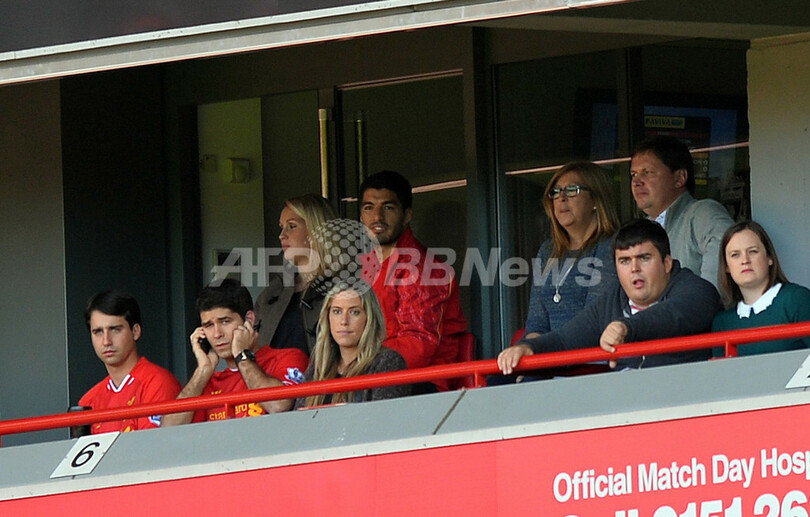 スタンドから試合を観戦するリバプールのルイス・スアレス(Luis Suarez、中央、2013年9月21日撮影)。(c)AFP/PAUL ELLIS