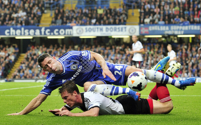 交錯するフラムのスコット・パーカー(Scott Parker、下)とチェルシーのギャリー・ケイヒル(Gary Cahill、2013年9月21日撮影)。(c)AFP/GLYN KIRK