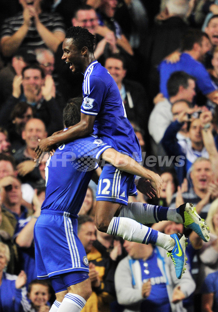 チーム2得点目を決めてチームメートのフランク・ランパード (Frank Lampard、左)と喜ぶチェルシーのジョン・オビ・ミケル(John Obi Mikel、右、2013年9月21日撮影)。(c)AFP/BEN STANSALL