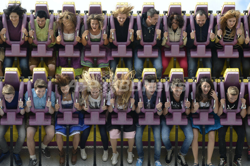 写真は、伝統的なバイエルン地方の民族衣装で来場し、移動遊園地の絶叫マシーンに乗った人たち(2013年9月21日撮影)。(c)AFP/CHRISTOF STACHE
