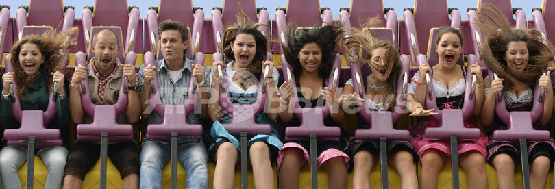 写真は、伝統的なバイエルン地方の民族衣装で来場し、移動遊園地の絶叫マシーンに乗った人たち(2013年9月21日撮影)。(c)AFP/CHRISTOF STACHE