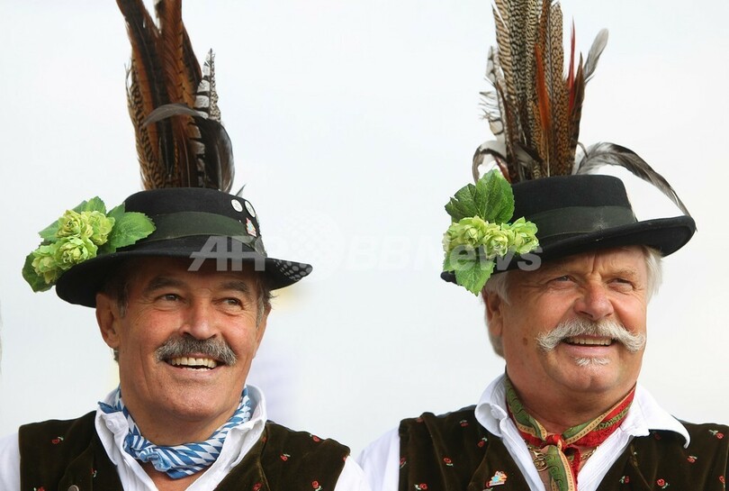 写真は、伝統的なバイエルン地方の帽子をかぶって来場した男性たち(2013年9月21日撮影)。(c)AFP/DPA/KARL-JOSEF HILDENBRAND
