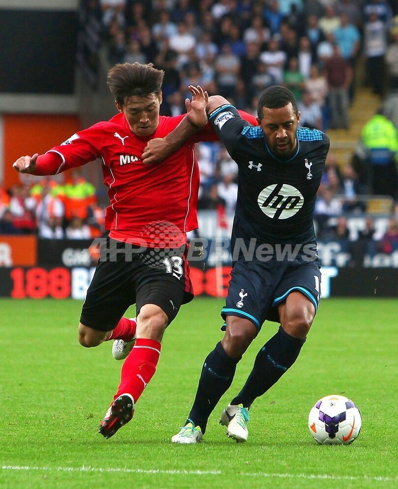 ボールを競るカーディフ・シティの金甫ギョン(Kim Bo-Kyung、キム・ボギョン、左)とトッテナム・ホットスパーのムッサ・デンベレ(Moussa Dembele、2013年9月22日撮影)。(c)AFP/GEOFF CADDICK