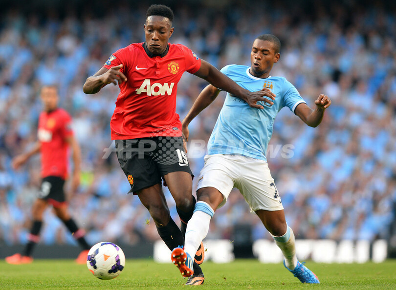 マンチェスター・シティのフェルナンジーニョ(Fernandinho、右)とボールを競るマンチェスター・ユナイテッドのダニー・ウェルベック(Danny Welbeck、2013年9月22日撮影)。(c)AFP/PAUL ELLIS