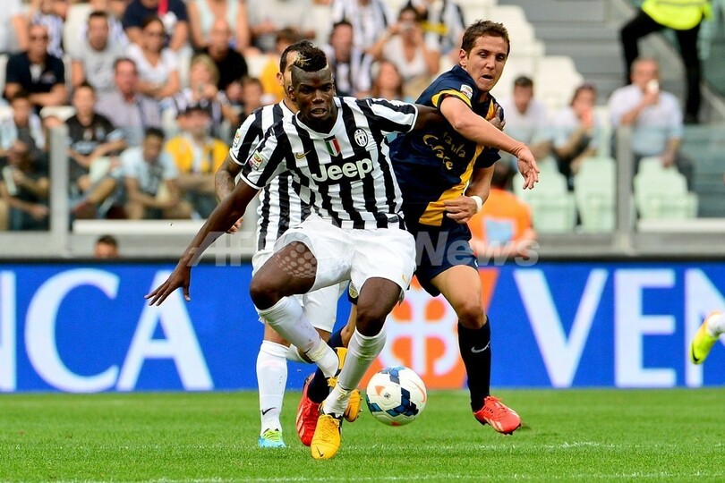 ボールを競るエラス・ベローナのフアン・イグナシオ・ゴメス・タレブ(Juan Ignacio Gomez Taleb、右)とユベントスのポール・ポグバ(Paul Pogba、2013年9月22日撮影)。(c)AFP/GIUSEPPE CACACE